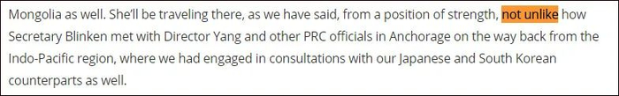 当时,来莱斯说,舍曼将“从实力的地位出发”(from a position of strength)飞往中国会谈,就像国务卿布林肯从印太地区回来的路上在安克雷奇会见杨洁篪和其他中方代表一样。