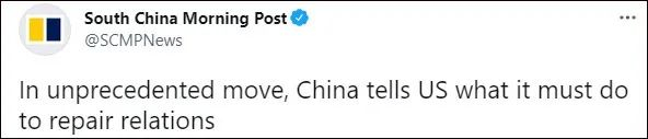 “中方的这一举动史无前例,”香港《南华早报》26日称,这是中方首次为中美关系划下“红线”,并明确向美方提出修复关系的补救措施。