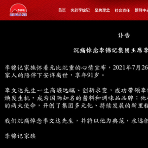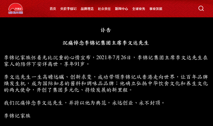 据李锦记集团官网消息,2021年7月26日,李锦记集团主席李文达先生在家人的陪伴下安详离世,享年91岁。