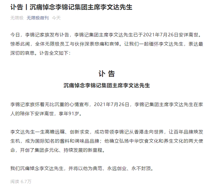 7月27日,无限极(中国)有限公司也在其官方微信发布了讣告。“惊悉此闻,全体无限极员工与伙伴深表悲痛和哀悼。”