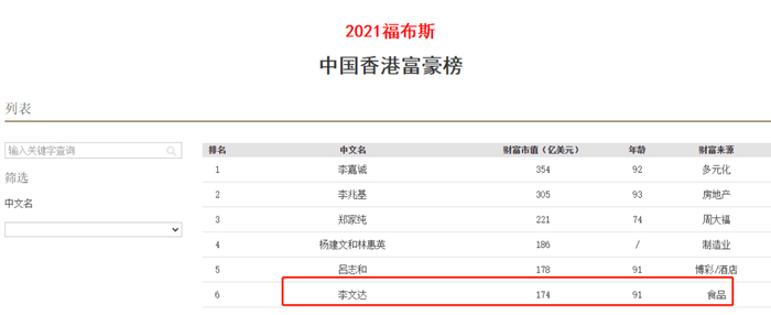 今年2月,福布斯公布最新的《2021中国香港富豪榜》,李文达排名居第6位,财富总额为174亿美元(约合1127亿元人民币),而去年该数字为152亿美元,旗下产业在在富豪榜中显示行业为“食品”。