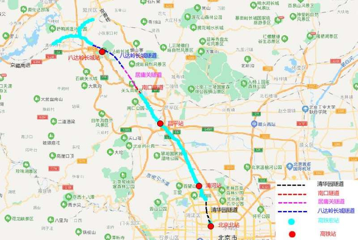 京张高铁东起北京北站,途经海淀、昌平和延庆后进入河北,在北京境内70.5公里,是一条设计平均时速为350公里/小时以上的智能化高速铁路。