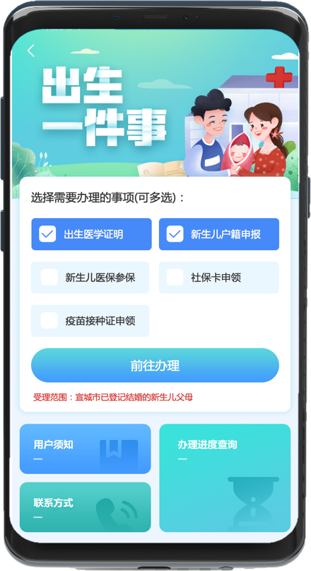 央广网宣城7月28日消息(记者 徐秋韵)迎接新生命,是许多家庭最幸福的瞬间。今年夏天,安徽宣城汪先生一家迎来了属于他们的喜悦,孩子一出生,汪先生就开始着手办理出生医学证明、户口登记、医保参保、申领社保卡、疫苗接种证等各类事务,如今在宣城,通过办理事项的流程再造,公安、人社、卫健、医保相关数据实现了互联互通。汪先生在医院办理出生医学证明的同时,通过“皖事通”的“出生一件事”即可“一表申请”要办理的所有事项,系统帮助完成后续所有事项的办理。系统在办理事项的同时,还会将办理进度及时推送消息告知用户,汪先生每完成一步都可以做到心中有数。