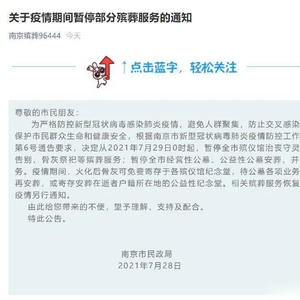 据南京市殡葬管理处,为严格防控新型冠状病毒感染肺炎疫情,避免人群聚集,防止交叉感染,有效保护市民群众生命和健康安全,根据南京市新型冠状病毒肺炎疫情防控工作指挥部第6号通告要求,决定从2021年7月29日0时起,暂停全市殡仪馆治丧守灵、遗体告别、骨灰祭祀等殡葬服务;暂停全市经营性公墓、公益性公墓安葬、并穴等业务。疫情期间,火化后骨灰可免费寄存于各殡仪馆纪念堂,待公墓各项业务恢复后再安葬,或寄存安葬在逝者户籍所在地的公益性纪念堂。相关殡葬服务恢复时间视疫情另行通知。