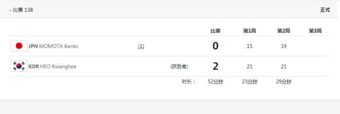 中新网7月28日电 北京时间28日晚,东京奥运会羽毛球男子单打小组赛继续进行,日本名将、现世界排名第一的桃田贤斗爆冷以0-2(15-21/19-21)不敌韩国选手许侊熙,最终以一胜一负的成绩位列小组第二,无缘16强。