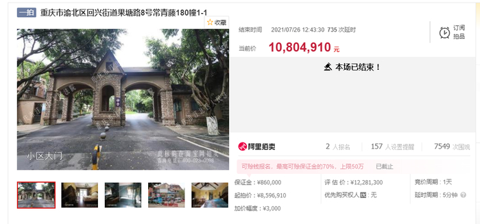 重庆常青藤别墅拍出1080万元 今年主城法拍别墅成交王为1800万元