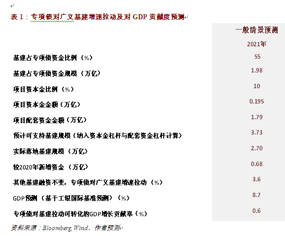 在基建发力空间有限的预期下,基建增速是否仍将起到托底经济增长的作用?长期来看,基建对经济下滑的托底效应显著。基于我们进一步的实证分析,若今年3.65万亿元专项债可全部发行,其中使用额度为3.6万亿元,则今年专项债将实际带动2.7万亿元的资金投向基建项目,并将拉动广义基建增速3.6个百分点。而专项债对广义基建的拉动可创造的GDP增长贡献率为0.6%(表1)。我们的预测反映基建对中国经济恢复仍将起到一定托底作用,但考虑到最终消费支出对中国GDP增长的贡献率高达60%,因此中国经济增长的主引擎仍将依赖消费的有效提振。