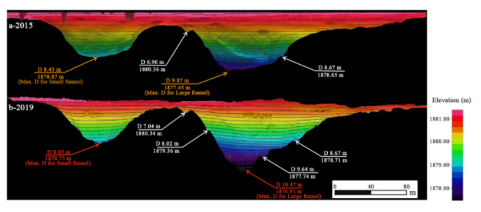 两个漏斗周边2015年和2019年沉积变化