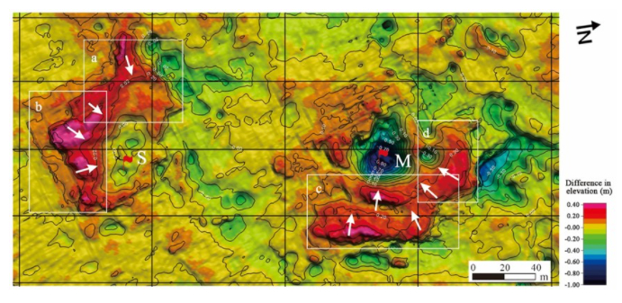 对比2015年10月和2019年9月探测结果发现,漏斗区的周围蠕动变形特征增强,出现了许多类似管涌现象的凹坑,主漏斗在2015年10月和2019年9月期间最大下沉深度增加60厘米。过去认为已经休眠的次级漏斗最大下沉深度增加20厘米,表明滇池构造漏斗存在下沉加速和活化的迹象和过程。同时,漏斗底部蠕变程度加大,指示正在发生小规模的漏水、造成沉积物随缓慢漏水过程外移。