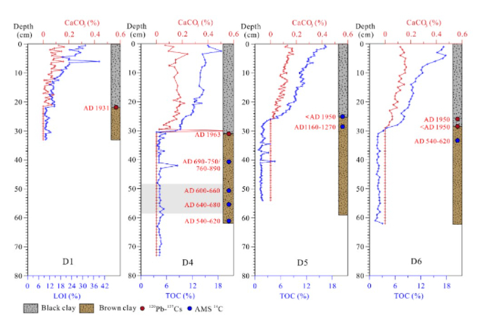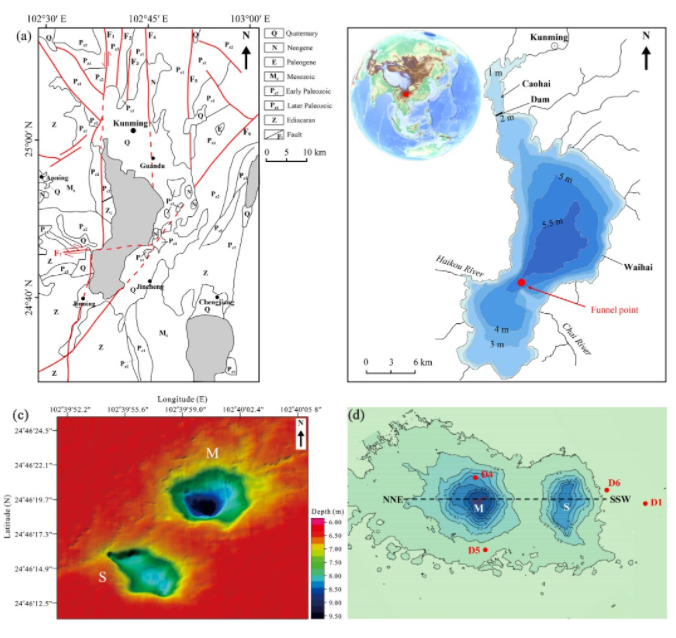 张虎才研究团队通过对滇池深水处漏斗区长期水下地形监测、湖泊柱状沉积物分析和地球物理勘探,分析漏斗区沉积物沉积特点、漏斗的演化发育过程,推测过去滇池可能存在漏水事件。研究发现,滇池漏斗位置存在明显的沉积间断。根据最小沉积速率估算,至少有69.24厘米的沉积物被侵蚀,这是发生漏水事件的记录。结合年代学数据和历史文献记载,他们推测漏水是引起公元1764年滇池干涸的主要原因。