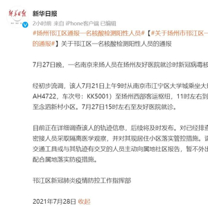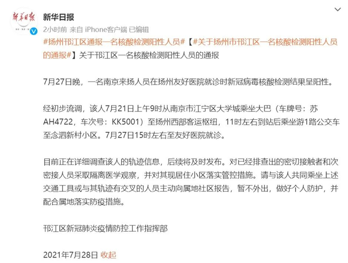 7月28日江苏省扬州市邗江区报告一起南京来扬人员核酸检测阳性。该人7月21日上午9时从南京市江宁区大学城乘坐大巴(车牌号:苏AH4722,车次号:KK5001)至扬州西部客运枢纽,11时左右到站后乘坐游1路公交车至念泗新村小区。7月27日15时左右至友好医院就诊。