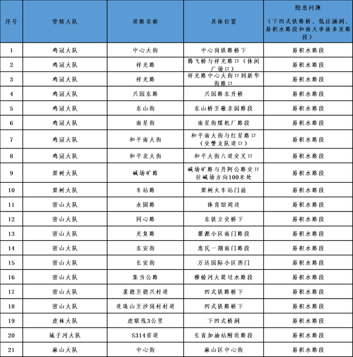 低洼积水路段:尚家北涵洞;肇宋路段;二道街至铁东地下通道;正阳一道街、三道街、五道街、六道街南北,九道街北侧。