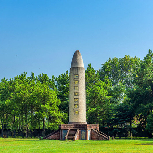 这座纪念塔始建于1934年2月,是为了纪念在革命战争中光荣牺牲的红军指战员。塔的造型独特,主体结构是一颗竖立的炮弹,底座呈五角形。塔高13米,塔身布满一粒粒小石块,象征着无数革命烈士的英灵。基座四周分别镶嵌着毛泽东、朱德、周恩来、博古、项英、洛甫、王稼祥、凯丰、邓发等领导人的题词。塔的正前方地面上铺写着“踏着先烈血迹前进”八个大字。塔的设计者就是具有传奇色彩的“龙潭三杰”之一的钱壮飞,而担任工程指挥的就是著名的红色宪法起草人梁柏台。