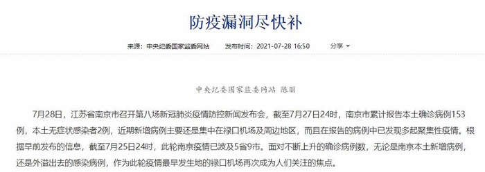 7月28日中纪委官网发布评论文章《防疫漏洞尽快补》,文章称,在境外疫情形势依旧不容乐观的情况下,禄口机场存在监管缺位、管理不专业等问题,疫情防控的各项措施没有落细落实。