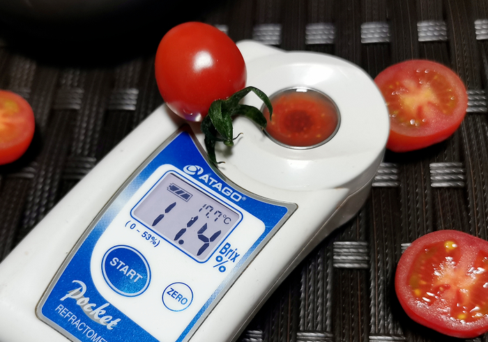 整个番茄的风味很集中,但果浆完全没有番茄的酸涩,倒有几分樱桃的甘甜,甜度比普通的番茄要高得多,却甜得很清爽!随手拿起一颗测甜度,糖度达到11度以上。我们并没有感到惊讶,因为吃的时候就已经被真实甜到了好嘛~