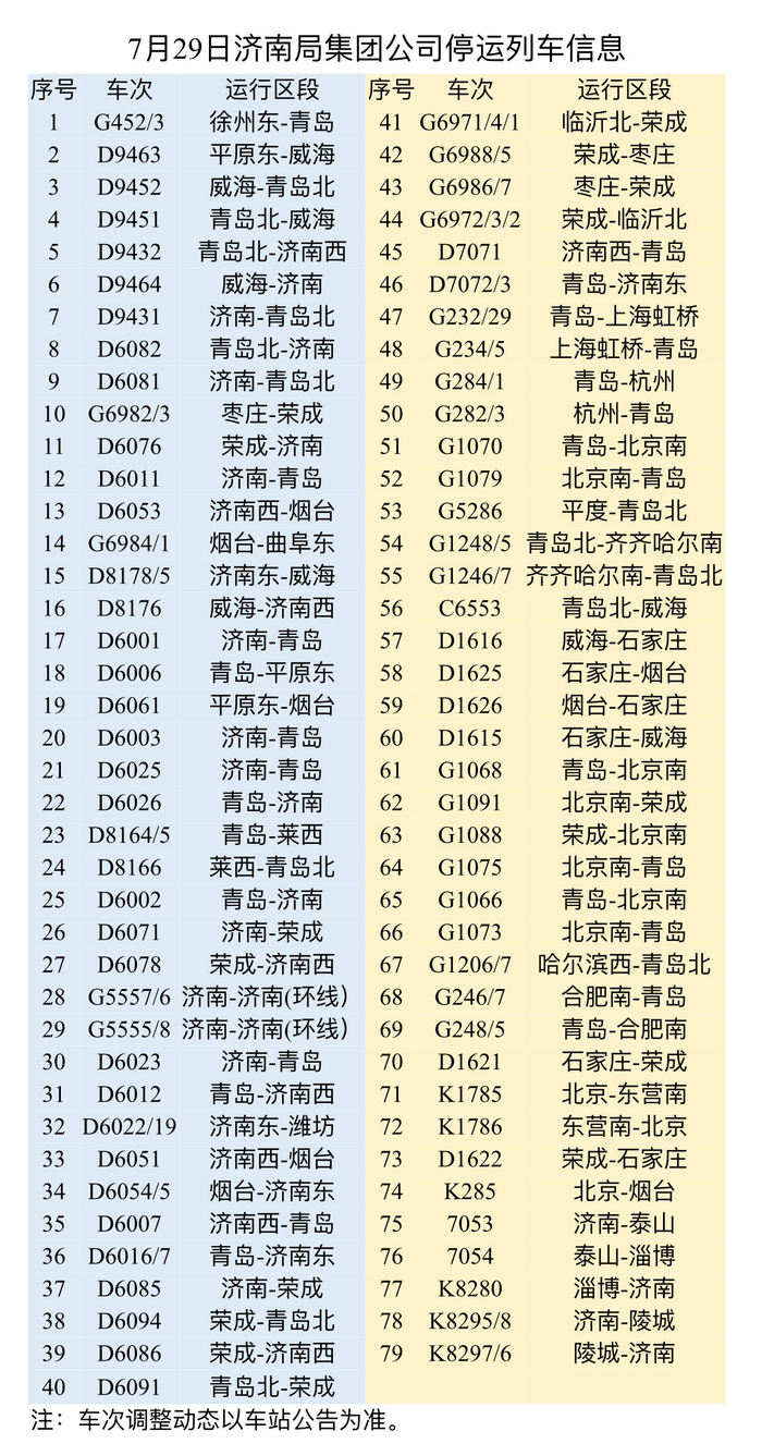 受台风“烟花”影响,国铁济南局7月29日停运79趟列车