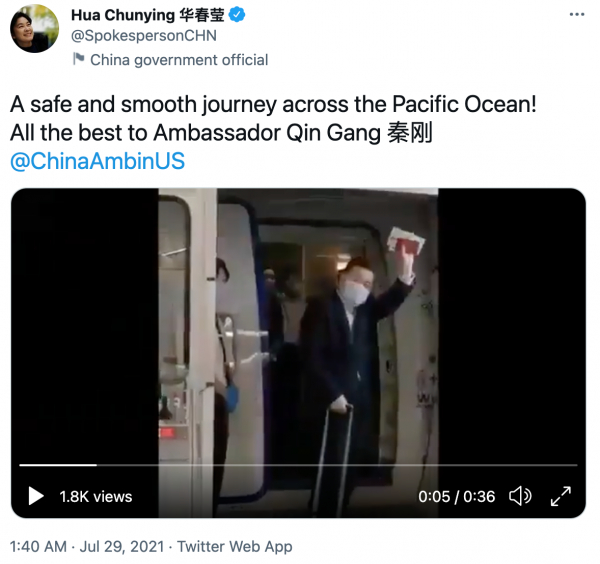 北京时间7月29日凌晨,中国外交部发言人华春莹在推特发布视频,祝福“秦刚大使”顺利抵达大洋彼岸。中国驻美大使馆的官方推特账号已经更新为秦刚。这意味,外交部副部长秦刚已接替驻美8年的崔天凯,成为新任中国驻美大使。