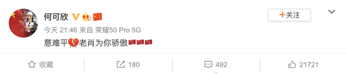 29日凌晨,肖若腾在微博中表示,“原以为我今天做不到了,但因为你!你!你!你!你...伟大的祖国!突然间就能做到原以为做不到的事儿!伤病、技术、命运、态度、这都不是事儿!我今儿就是展示,展示什么是中国运动员的意志品质!什么是勇气!什么是精神!”↓