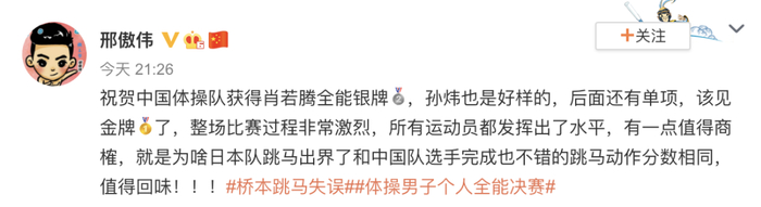 “我想我们运动员已经在场上展示出了不服输的精神,另外,也展现了我们中国体操的精湛技术。对待最后的结果,肖若腾也表现很大度,向桥本大辉和纳格尔内都表示了祝贺。肖若腾最后单杠因为结束后没有向裁判示意被多扣了0.3分。”