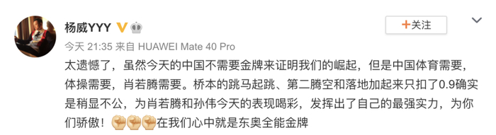 赛后,包括李小鹏、杨威、何可欣在内的多位中国体操圈退役名将,纷纷站出来发声表示遗憾,但仍为肖若腾骄傲。