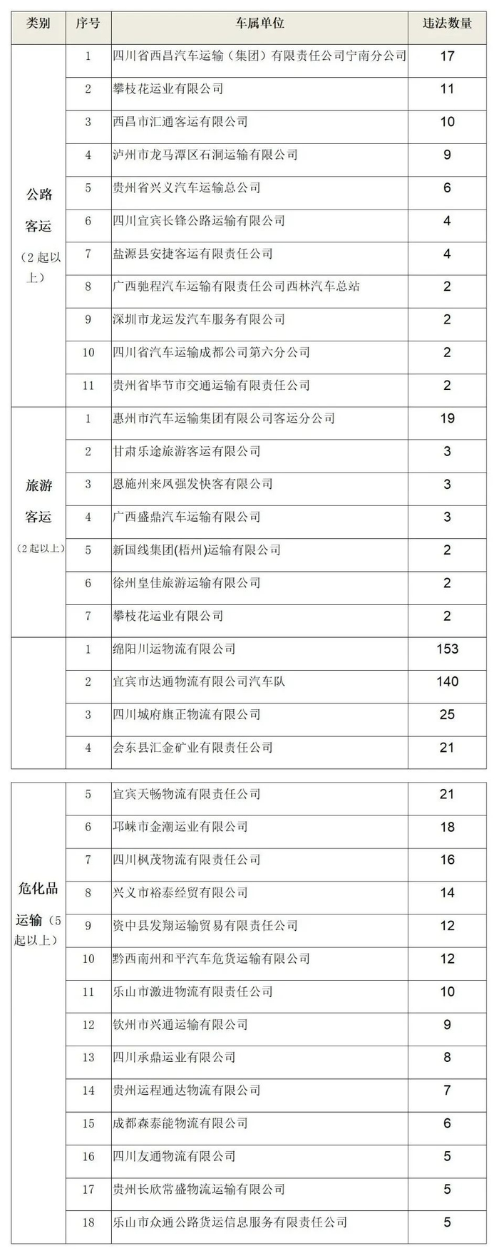 从交通违法数量来看:绵阳川运物流有限公司(153 起)、宜宾市达通物流有限公司汽车队(140起)、四川城府旗正物流有限公司(25起)、四川会东县汇金矿业有限责任公司、宜宾天畅物流有限责任公司(各21起)5家外省危化品运输企业交通违法较为突出。
