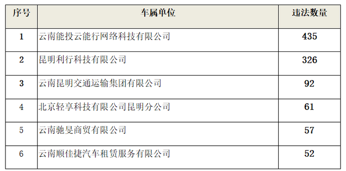 6月,全省共查处网约车交通违法2498起,同比下降59%,环比下降17.2%。涉及285家网约车公司,其中,交通违法数量50起及以上的网约车公司有6家,如下表所示: