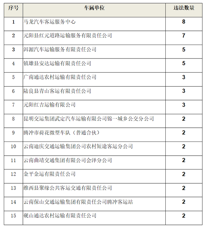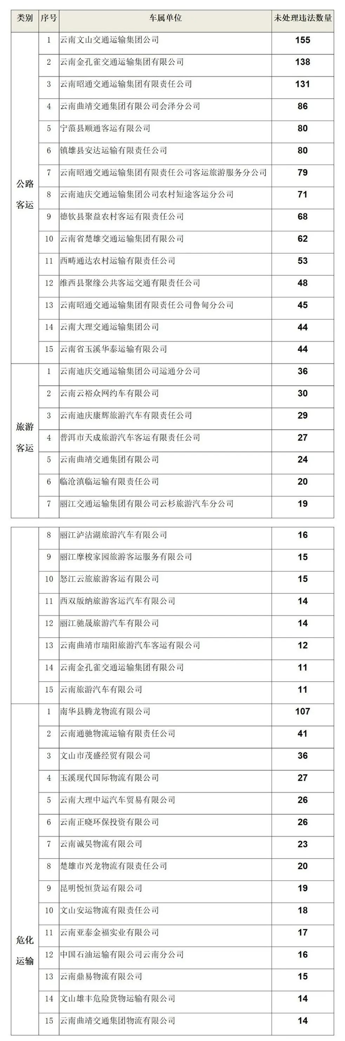 其中,公路客运车辆3038起,涉及254家公路客运企业;旅游客运车辆569起,涉及107家旅游客运企业;危化品运输车辆852起,涉及146家危化品运输企业。其中,未处理交通违法较多的道路运输企业如下表所示: