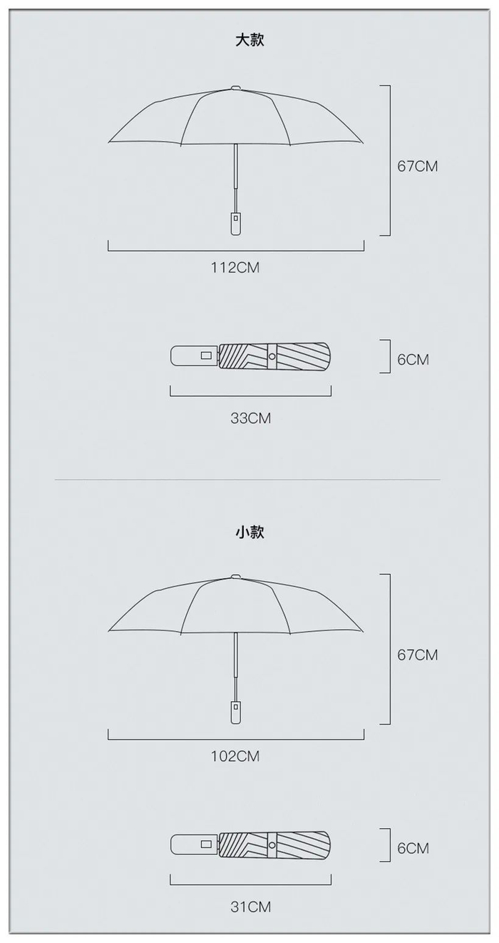伞面大小:分大小两款,大款撑开尺寸为112cm,小款撑开尺寸为102cm