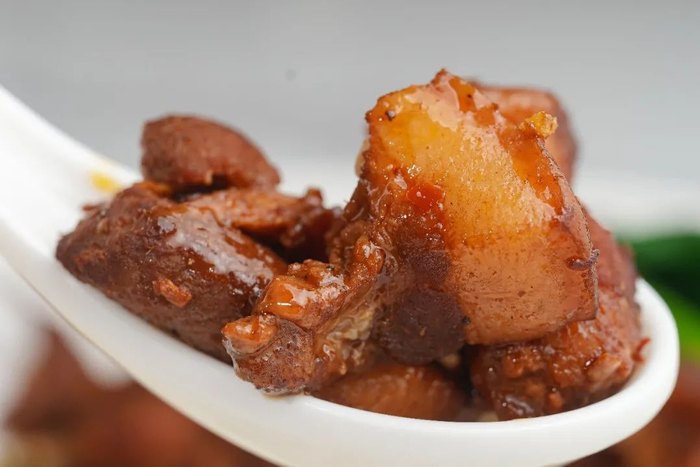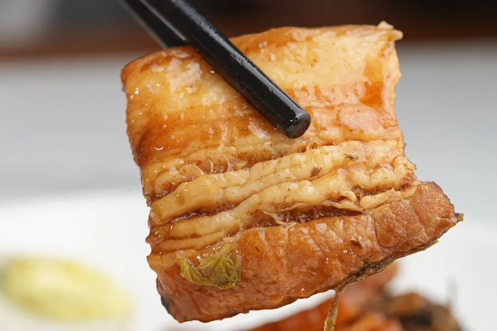 软烂的东坡肉肥肉入口即化,瘦肉则丝毫不会塞牙,软糯与醇厚两种口感在嘴中交织,浇上咸鲜的酱汁后,肥而不腻,是下饭的好帮手~