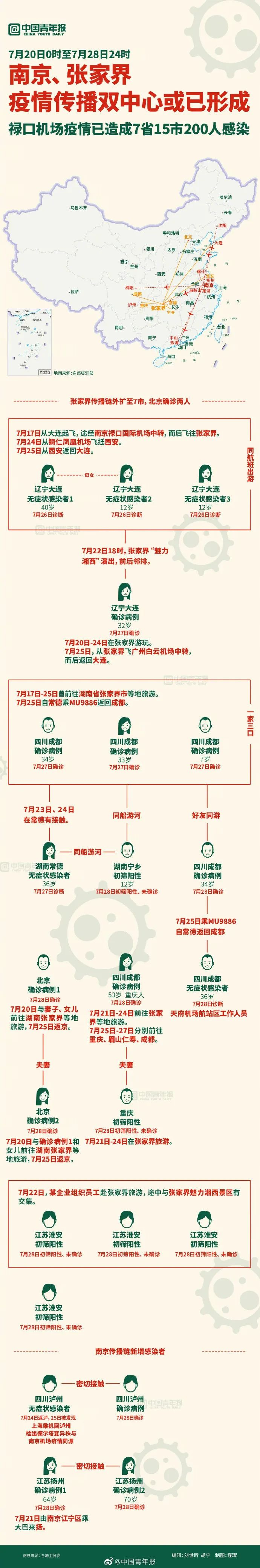 据统计,7月20日0时至28日24时,南京禄口机场相关疫情已造成全国7省15市200人感染,其中南京本地感染者173例。南京传播链28日增扩到扬州。同时,由南京病例外溢到张家界引发的新传播链,目前以张家界为中心,外扩至包括北京、成都在内的7市。
