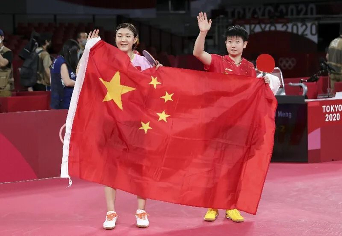 7月29日,在东京奥运会乒乓球女子单打决赛中,中国选手陈梦以4比2战胜队友孙颖莎,夺得冠军。 新华社记者 吕小炜 摄