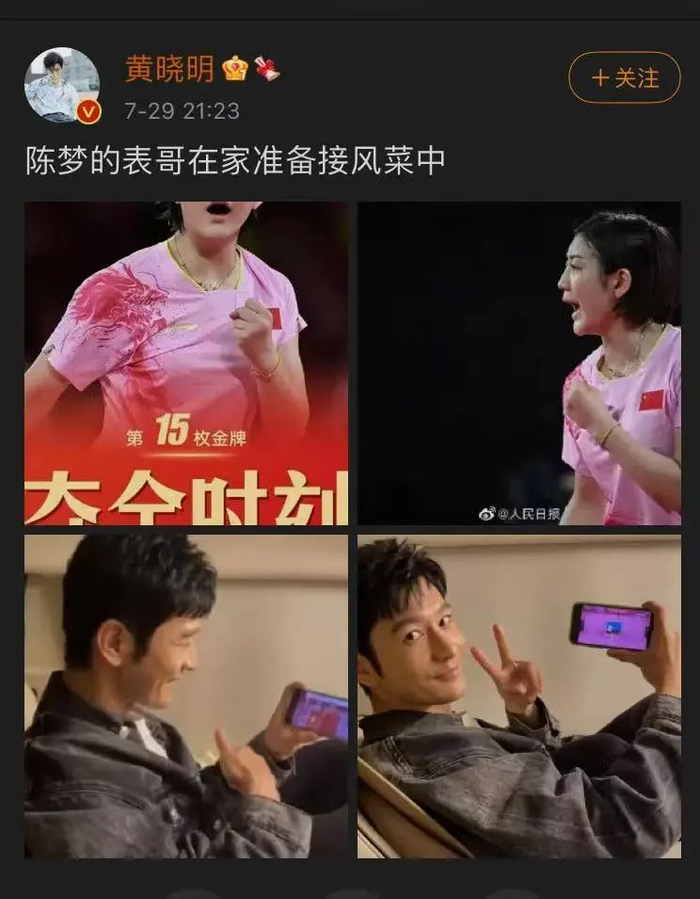 陈梦的表哥黄晓明第一时间晒图发文向表妹道贺。