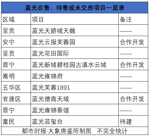 据大象房鉴所不完全统计,蓝光目前在昆明还有9个项目在售。