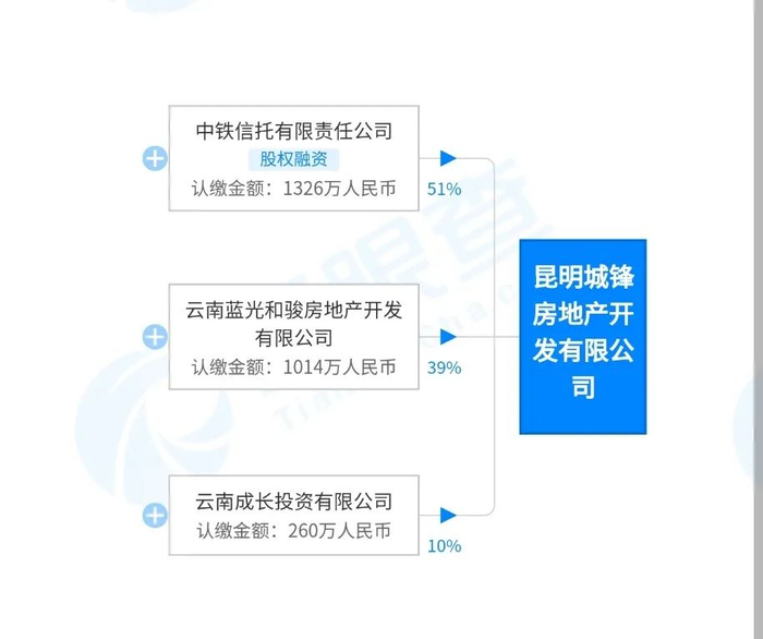 此前,中铁信托占城铭地产37%的股份,今年5月,中铁信托增股至85%。也就是说,单从股东信息上看,蓝光芙蓉1891的开发商昆明坤锦地产大大股东为中铁信托,但蓝光依然占股。