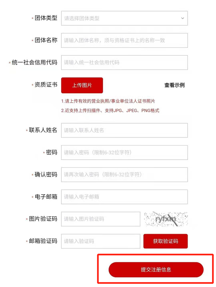 如实填写相应信息,点击【提交注册信息】;