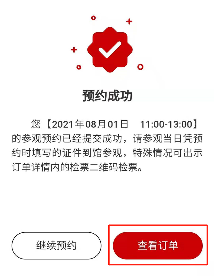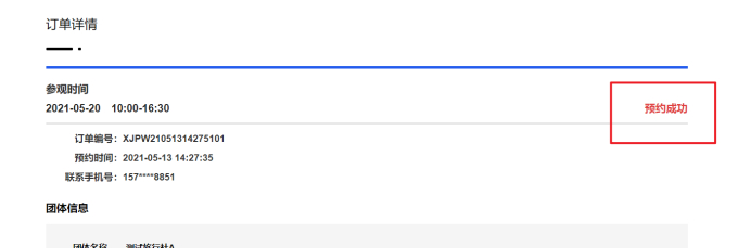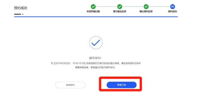 成功预约后会跳转到预约成功的界面,您可点击【查看订单】查询订单详情。