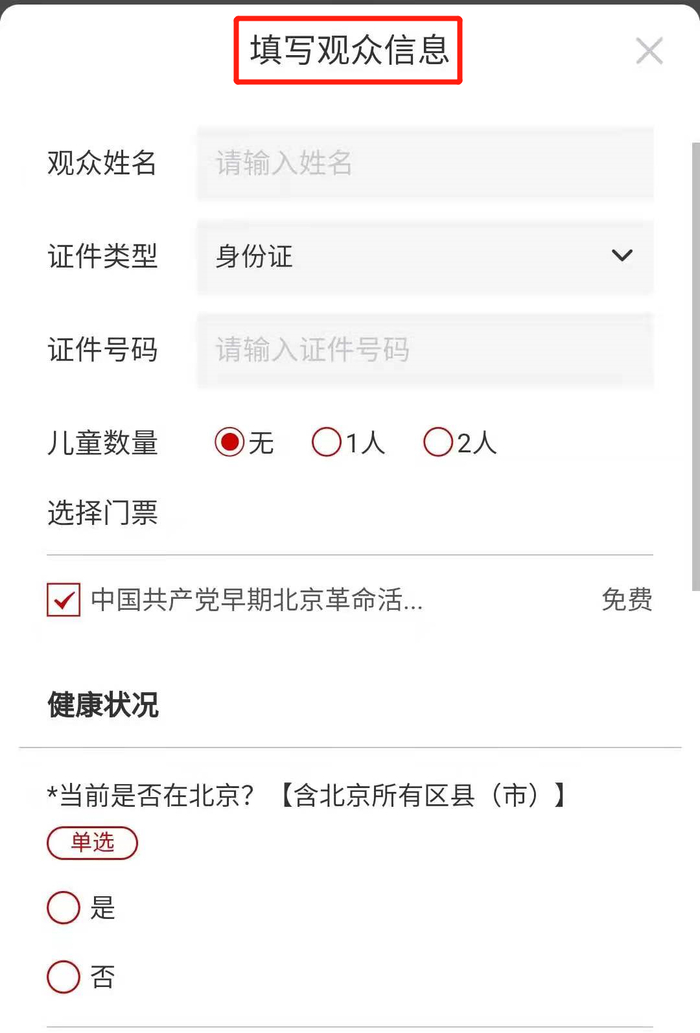 观众出示本人预约时使用的身份证原件,提前准备好本人实时健康码(可通过北京健康宝小程序申领)、14天到访地行程查询和预约二维码,配合工作人员检查和健康监测,相关信息未见异常的方可入馆。