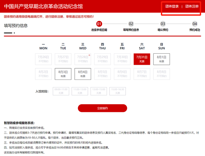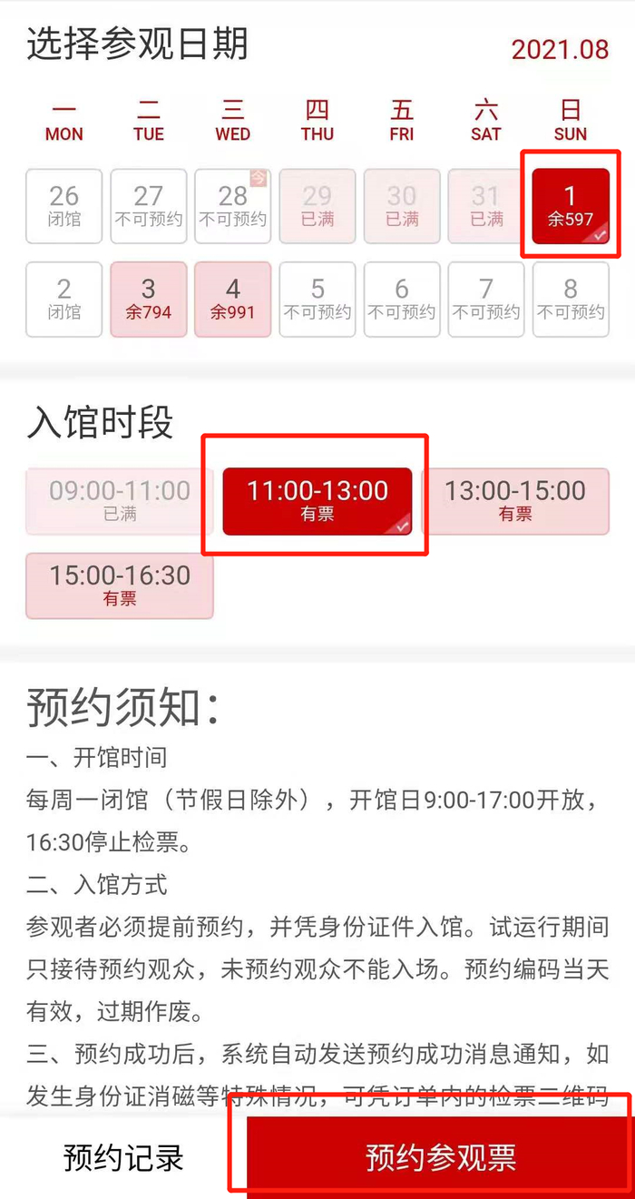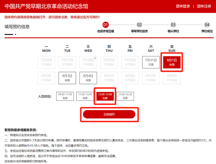 选择【参观日期】和【入馆时段】,点击【立即预约】;