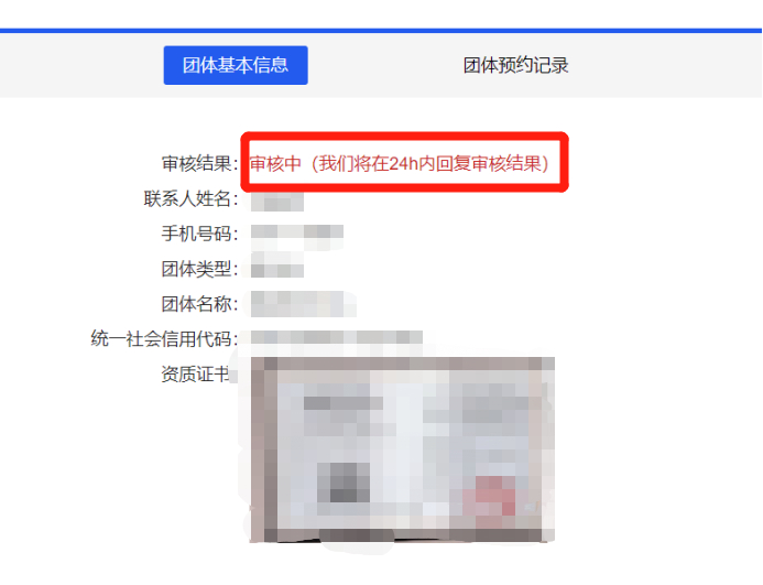 提交注册信息后团体用户会显示以下界面,等待馆方工作人员对信息进行审核;