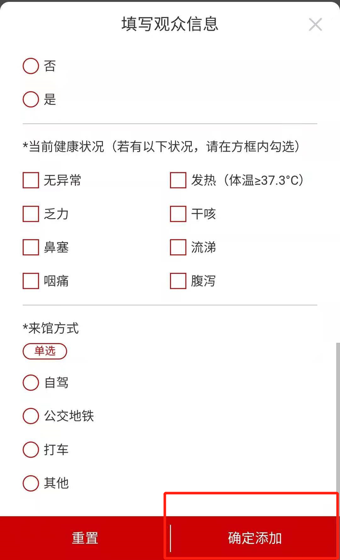如实填写个人信息及健康状况信息,点击【确定添加】;