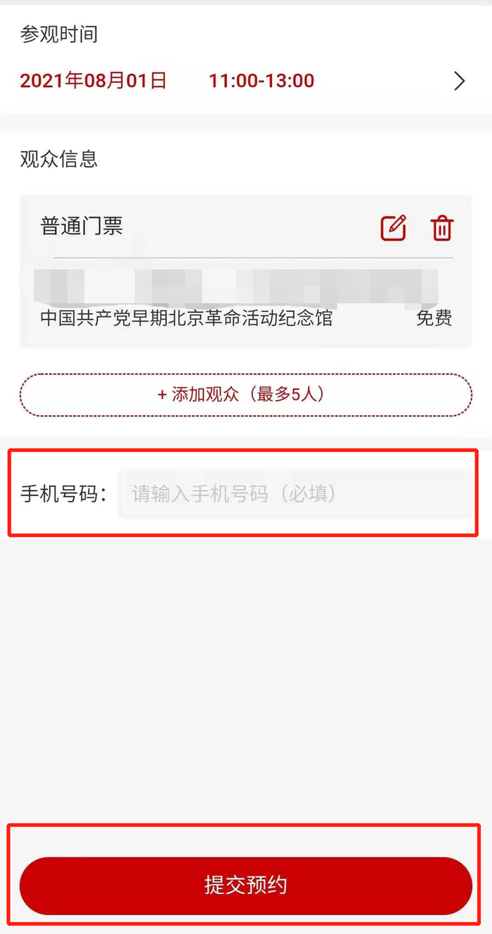 填写手机号码,点击【提交预约】,一位观众最多可以添加五位同行人员;