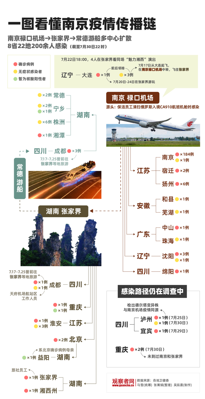 导读:从禄口国际机场,到张家界景区,再到常德游船,南京疫情传播链不断延长。据观察者网统计,截至30日22时,已有8省22地200余人感染。