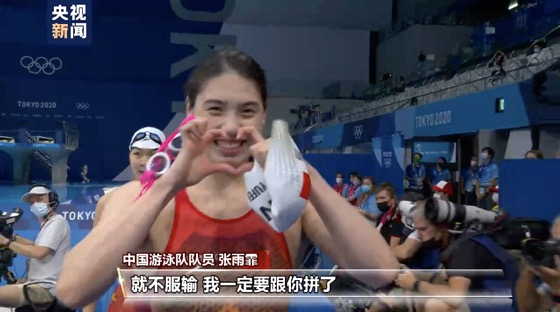 中国游泳队队员 张雨霏:前150米我都是说,算了算了。我觉得人家肯定比我快,因为200米自由泳不是我主项。游到最后50米,我也不知道哪来的力量,就是那种中国力量,从心底里燃起来,就不服输。我一定要跟你拼了!