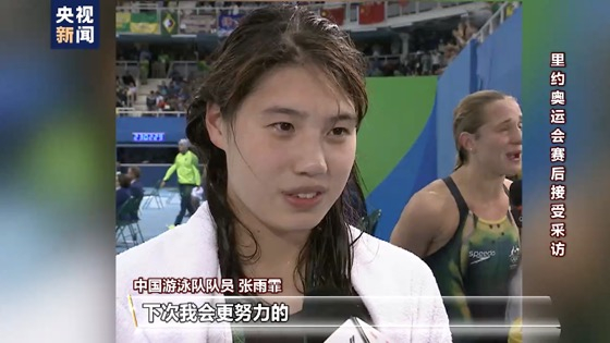 中国游泳队队员 张雨霏:(女子200米蝶泳第6名)有点遗憾,下次我会更努力的。我总觉得有点对不起自己的教练,还有那么多观众的期望。