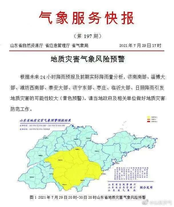 省自然资源厅、省应急管理厅和省气象局于7月29日17时联合发布地质灾害气象风险预警:根据未来24小时降雨预报及前期实际降雨量分析,济南南部、淄博大部、潍坊西南部、泰安大部、济宁东部、枣庄、临沂大部、日照降雨引发地质灾害的可能性较大(黄色预警)。(山东商报·速豹新闻网记者 郑芷南)