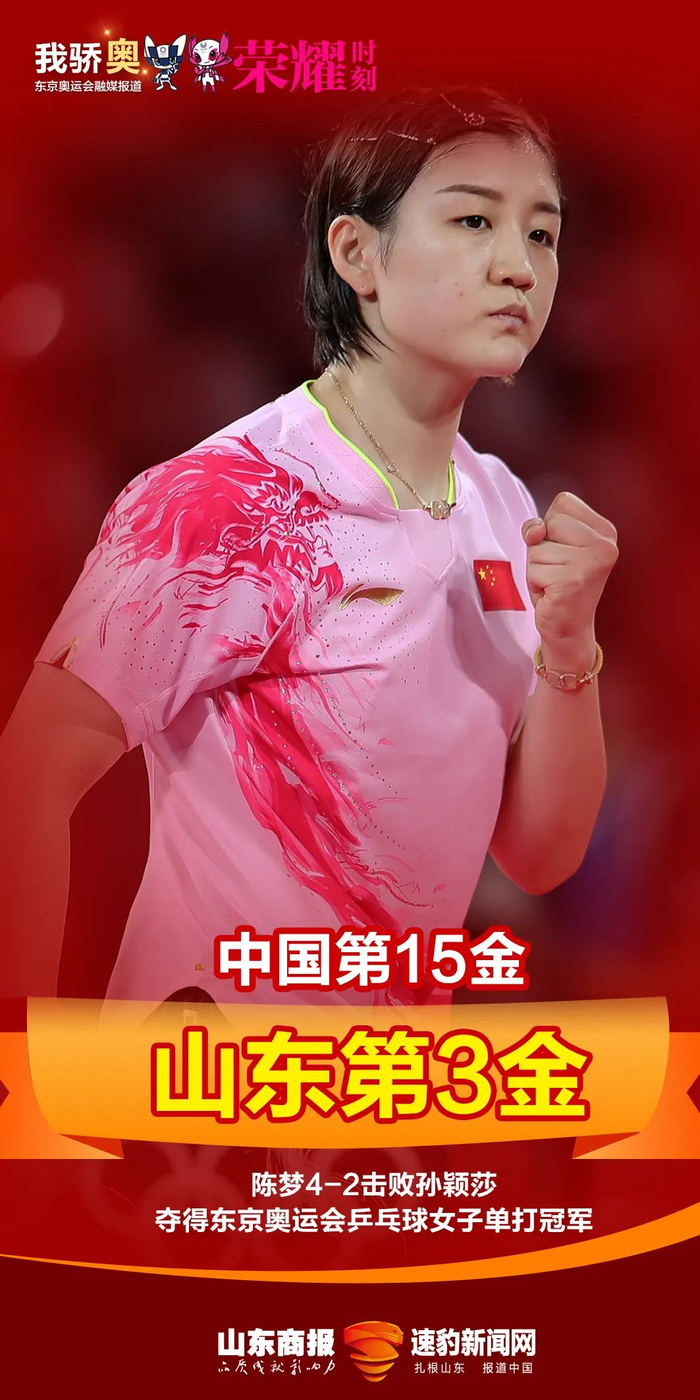 7月29日,陈梦4-2击败孙颖莎夺得东京奥运会乒乓球女子单打冠军,拿下中国第15金,山东第3金。