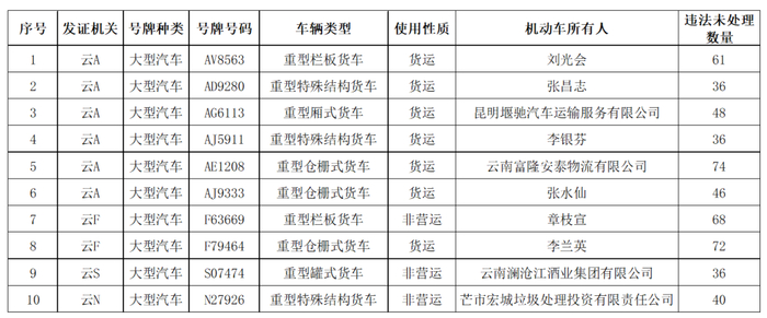 全省重型货运汽车违法未处理数量较多的车辆如下: