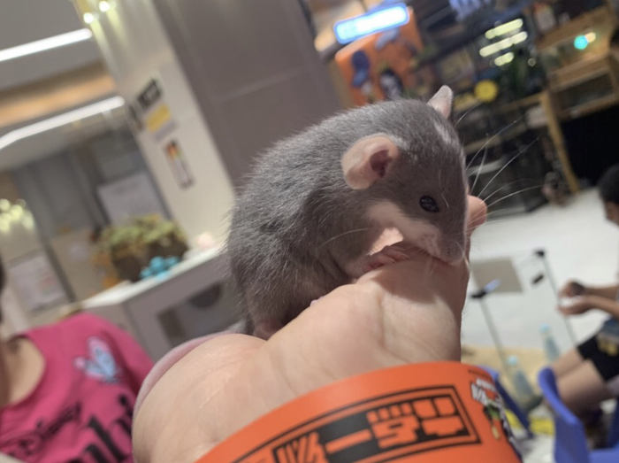位于商场里的外区则热闹许多,这里的就餐区与互动区没有被隔开,消费者可以自由地与动物近距离接触。柯尔鸭在距离餐桌一米远的水池中游动,两只蜥蜴趴在没有任何遮挡的柜子上,小香猪被拴在地上,来店里玩耍的小朋友人手一只小鼠,还有小朋友把花枝鼠带到餐桌上陪自己吃饭。