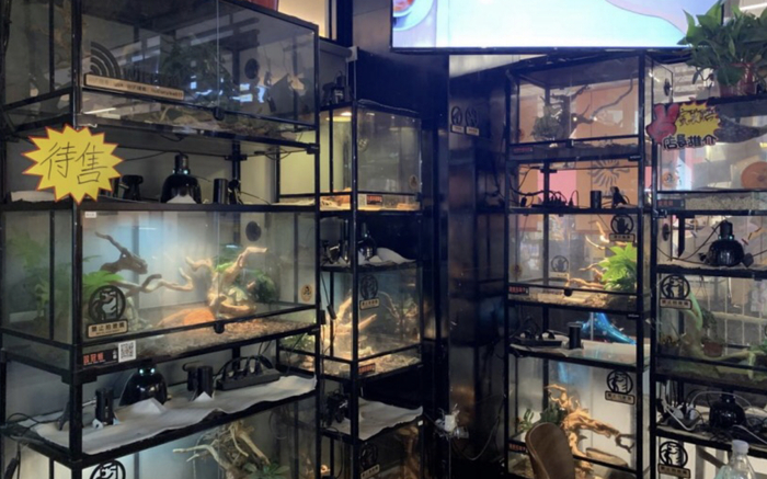 记者注意到,这家餐吧主要分为两个区域,吧台所处的内区设置有就餐区域和玻璃饲养柜,关在里面的除了几只正处在发情期的宠物貂和龙猫外,几乎全是有毒的爬行动物,不能与顾客直接接触。