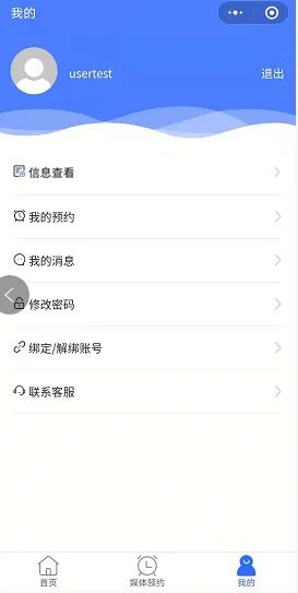 在“我的”页面,包含信息查看、我的预约、我的消息、修改密码、绑定/解绑账号、联系客服等六个功能模块。